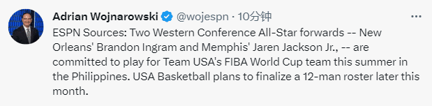 随着英格拉姆和小杰克逊承诺出战世界杯,美国队12人大名单已经确地8人,他们分别是米卡尔-布里奇斯(篮网)、布伦森(尼克斯)、爱德华兹(森林狼)、哈利伯顿(步行者)、波蒂斯(雄鹿)、里夫斯(湖人)。