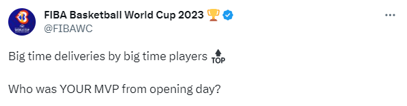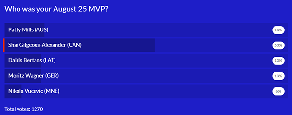 FIBA公布世界杯揭幕日最佳球员,同时发问谁是世界杯首日的MVP?球迷热议并且力挺亚历山大MVP,在官方投票结果中,目前1270人投票,亚历山大获得53%的投票,得票率远超其他四名球员。