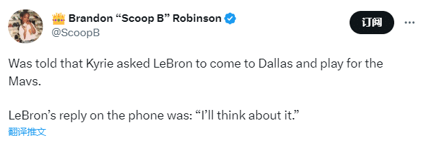 来源:24直播网06-08 12:1224直播网讯06月08日近日欧文招募詹姆斯加盟独行侠的重磅消息引发巨大热议,究竟当时詹姆斯是如何回应欧文的?NBA名记布兰登-罗宾逊爆料,当欧文招募詹姆斯前往独行侠打球时,詹姆斯在电话里回应:我会考虑的(I’ll think about it)。