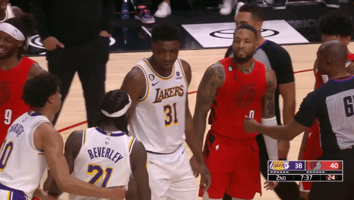 第二节7分37秒,利拉德执行罚球时和贝弗利发生口角,据美媒报道,当时利拉德对贝弗利放狠话:我会狠踹你的屁股,贝弗利不满回嘴并且吃到技术犯规。