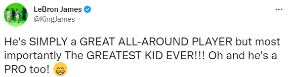 来源:24直播网01-20 14:5724直播网01月20日讯 ,詹姆斯在社媒媒体上转发布朗尼的比赛集锦,发文狂赞自己的大儿子,发推写道:他确实是一名伟大的全能球员,但最重要的是,他是有史以来最伟大的孩子!!!哦,他也是一名职业选手!