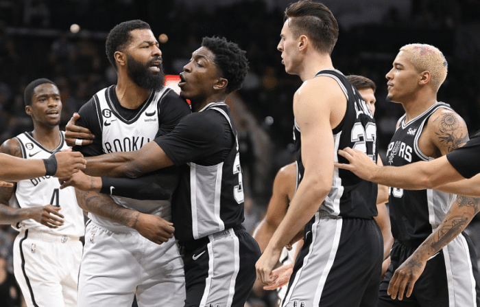 在冲突的另一侧,西蒙斯本想拉开科林斯,引后者不满,他们两人险些起冲突,篮网主帅安抚西蒙斯,后者坐回替补席。