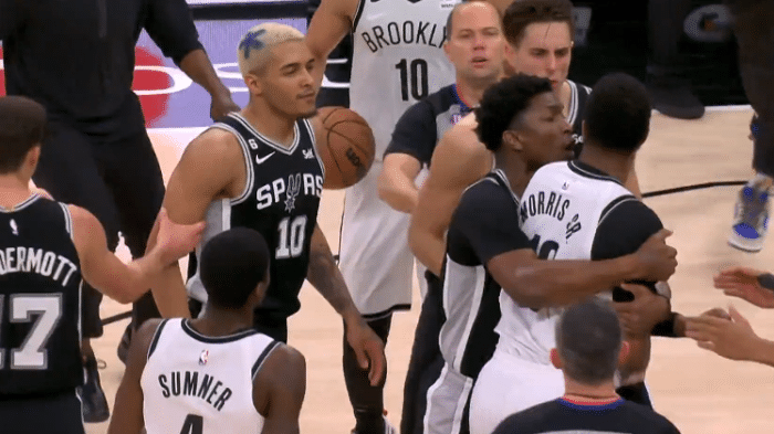 对于这一次意外事件,最终裁判吹罚索汉一级恶意犯规,大莫里斯吃到技术犯规,其他人都没事,马刺罚球1次(技术犯规罚球),篮网罚2球(恶意犯规罚球),篮网拥有球权。