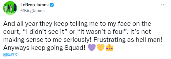 上一场湖人1分惜败76人,詹姆斯全场出战35分钟拿到35分10助攻8篮板1盖帽1抢断仍输掉比赛,生死时刻,威少单挑恩比德错失绝杀,赛后威少手腕被恩比德抓住引争议,裁判报告表示恩比德未犯规,对此詹姆斯发声表不满:整整一年,他们一直在球场上当着我的面跟我说,‘我没看到’或‘这不是犯规’。这对我来说没有任何意义!这真让人沮丧。