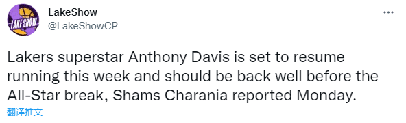 浓眉何时能够复出?据名记shams报道,浓眉将在不久恢复对抗训练,预计将在全明星赛前的几场比赛中重返赛场,可能在2月初复出。