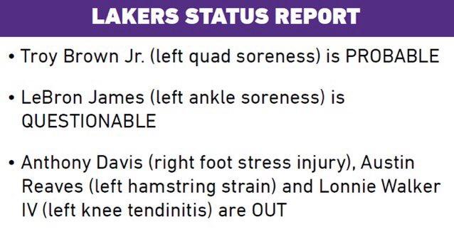 特洛伊-布朗(左侧股四头肌酸痛)大概率出战;詹姆斯(左脚踝酸痛)出战成疑;安东尼-戴维斯(右脚应力性伤病)、里夫斯(左腿筋拉伤)、朗尼-沃克(左膝肌腱炎)缺席比赛。