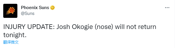 目前太阳队伤员很多,布克(腹股沟拉伤)、保罗(臀部伤势)、佩恩(右脚)、约翰逊(半月板撕裂)和沙梅特(臀部),他们因伤连续缺席多场比赛,布克已经连续缺席11场比赛,约翰逊已连续缺席36场,太阳伤病满营又伤一人,希望奥科吉的伤势别太严重。