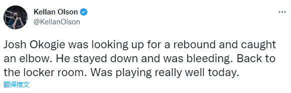 今日一战,奥科吉替补上场9分钟,6投3中按到9分1篮板,无奈仅打9分钟,不幸遭艾顿肘击误伤,被迫退出比赛;目前还不确定奥科吉鼻子受伤的严重程度,被肘击这一下确实太吓人。