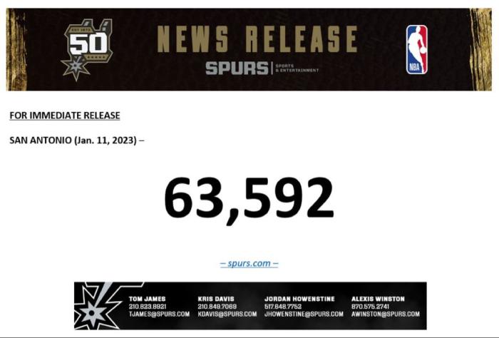 马刺迎战勇士已售出63592张门票 打破NBA历史第一上座纪录