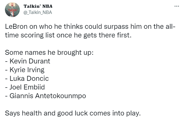 詹姆斯多次表态他从未刻意追求历史得分王,传球才是他的第一要务,一切都是为了胜利;外界曾说未来东契奇有可能超越詹姆斯,对此卢卡本人表示他不会打20年那么久的。