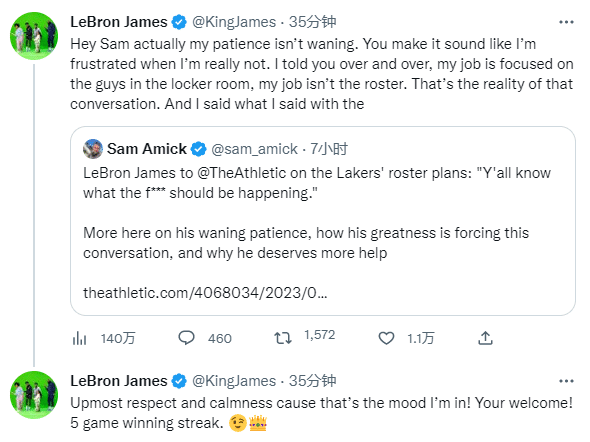 詹姆斯爆粗回应湖人管理层不作为的交易态度,美媒点评:詹姆斯已经厌倦了等待湖人的动作;之后詹姆斯本人正式澄清。