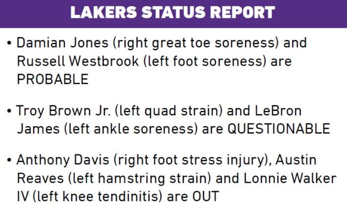 湖人队伤员很多,多达7名球员出现在伤病名单上,其中浓眉暂无具体复出时间,里夫斯和沃克至少伤停2周;詹姆斯和威少有伤仍坚持出战;上一场,湖人主场击败老鹰,从而喜提四连胜;而今天客场背靠背对阵国王,詹姆斯出战成疑,威少大概率出战,詹威或出战冲击5连胜。