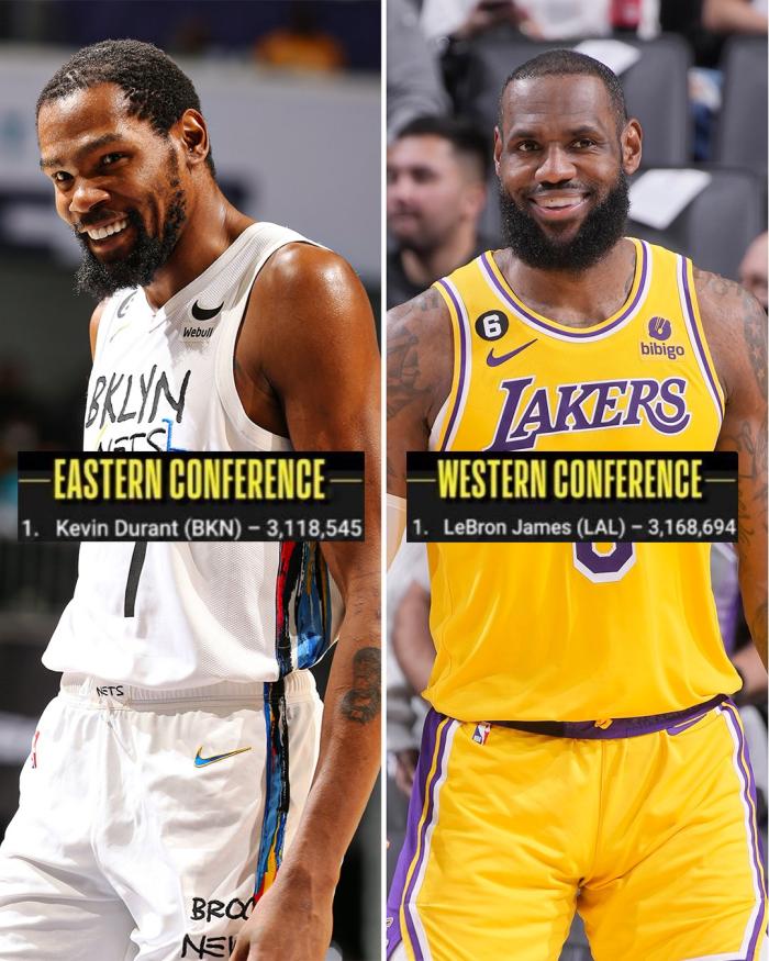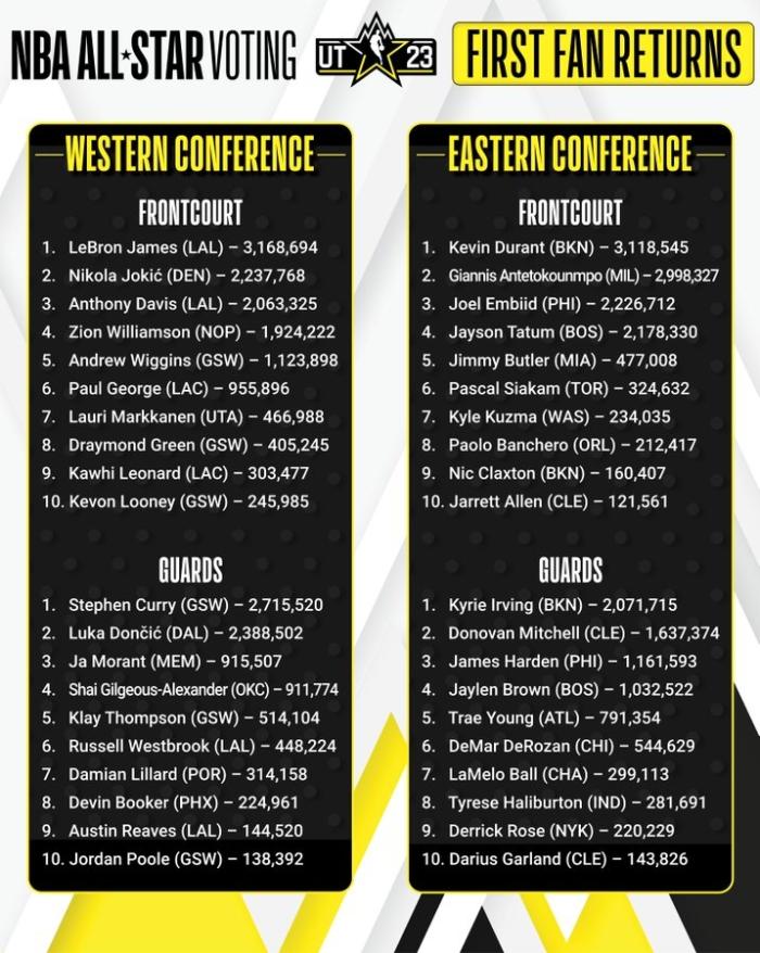 在今年全明星赛投票结果中,目前詹姆斯已经获得3168694票,力压杜兰特成为第一阶段全明星赛票王,不过老詹仅比KD多5万多票;目前联盟仅有詹姆斯和杜兰特两人票数突破300万大关,杜兰特领跑东部;另外值得一提的是,欧文2071715票和库里2715520票领跑东西部后卫榜。