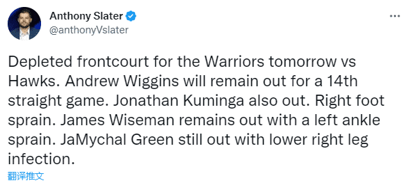 勇士公布最新伤情:库明加伤停库里继续休战 维金斯连续第14场缺席