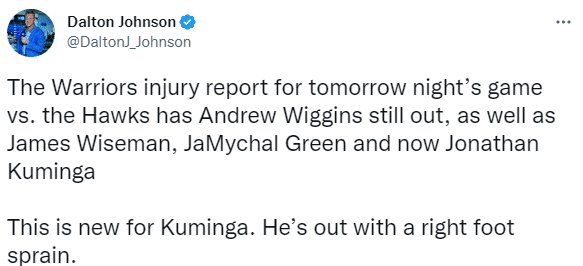 勇士全队6名球员因伤缺战老鹰,前场阵容破败不堪,维金斯因病连续第14场缺席比赛,库里距离复出还需要一段时间,另外勇士又添伤员,库明加右脚扭伤也无法出战,本赛季库明加为勇士打了33场比赛,场均拿到7.5分3.2篮板1.7助攻,最近一段时间,库明加的表现还是不错的。