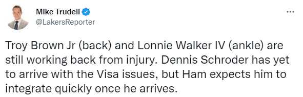目前特洛伊-布朗(背伤)和朗尼-沃克(脚踝轻微扭伤)仍在康复之中,施罗德因签证问题还没有归队,哈姆希望施罗德回归后能够很快融入球队。