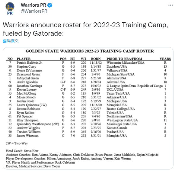 勇士官宣20人大名单:伊戈达拉正式归队 库里领衔14+2核心卫冕阵容