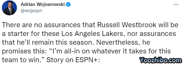 来源:24直播网09-26 11:1324直播网09月25日,ESPN名记沃纳罗斯基撰文报道,即使没有获得留队保证和首发保证,威少仍旧表示:我会全力以赴帮助湖人获胜;这就是深陷交易流言之中时,威少的心态,甘愿担任任何角色,仍相信湖人三巨头不可阻挡。