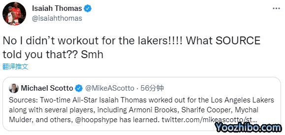 小托马斯转发Michael Scotto的相关报道,并且发推辟谣写道:不,我没有为湖人试训!!!哪个消息源告诉你的???