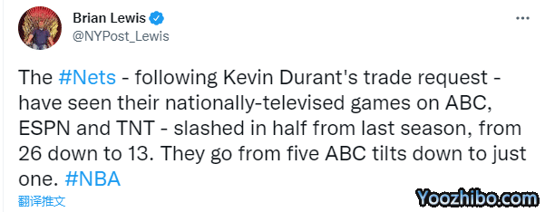 篮网跟队记者Brian Lewis报道,从ABC、ESPN和TNT三大转播商获悉,由于杜兰特申请交易,原定于26场常规赛全美直播的篮网队,全美直播被缩减到只剩下13场。其中ABC电台更是将之前的五场篮网全美直播消减到仅剩1场。