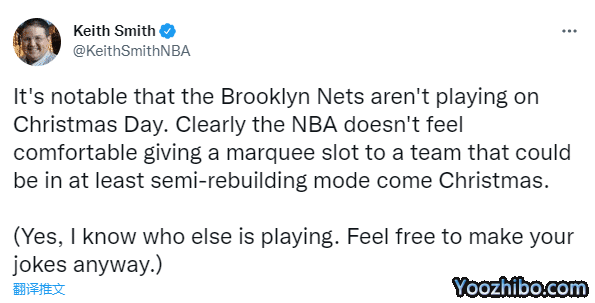 篮网、快船、热火等队都无缘年终大战,NBA名记Keith Smith发推写道:值得注意的是,布鲁克林篮网队没有参加年终大战。显然,NBA不想安排一支处于半重建模式的球队参加年终大战。