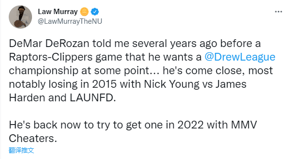 对于德罗赞参加德鲁联赛季后赛,快船记者Law Murray发推透露:几年前,德罗赞在猛龙对阵快船的比赛前告诉我,他希望能在某个时间点获得德鲁联赛的冠军,现在他正在靠近他的目标。最值得注意的是2015年他与尼克-杨搭档输给了哈登所在球队;现在他正在试图与MMVCheaters队一起夺冠。