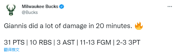 在国际赛场上,字母哥降维打击变身大杀器,20分钟31+10无人可挡,雄鹿官方夸赞字母哥,晒赛场照并且配文写道:扬尼斯在20分钟内造成了很大的伤害。