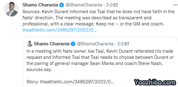 据报道,当地时间周末,在与篮网老板蔡崇信的会面中,杜兰特重申了他的交易请求,消息人士称,杜兰特对于球队的发展方向没有信心。