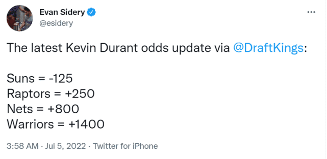 杜兰特的下家赔率更新:太阳( -125)依然处于领跑位置,但排名第二的猛龙(+250)已经逼近太阳。篮网(+800)和勇士(+1400)也在榜单上。