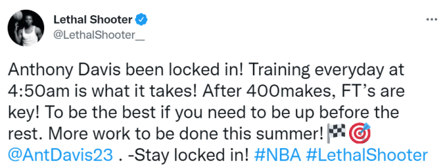 “浓眉太专注了!每天凌晨4:50起床训练!要命中400个罚球!”训练师写道,“夏天还有更多的工作要做,戴维斯保持专注。”