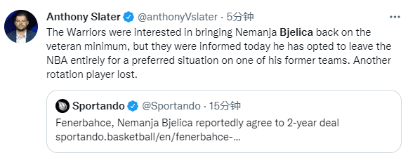 另外别利察也离开勇士,他和土耳其球队签下2年合同,暂时离开NBA;勇士有意给别利察一份老将底薪合同,但后者选择离开NBA;21-22赛季,别利察常规赛出战71场比赛,场均6.1分4.1篮板2.2助攻,季后赛场均2.9分2.1篮板1.1助攻,今夏生涯首次夺冠。
