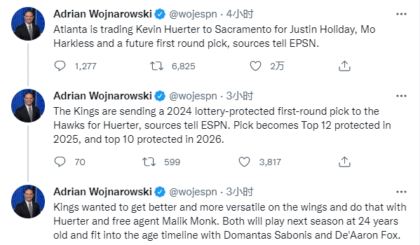 老鹰将凯文-赫尔特交易至国王,得到贾斯廷-霍勒迪、莫里斯-哈克利斯和1个未来首轮签;该首轮签的保护条件分别为2024年乐透、2025年前12顺位和2026年前10顺位,若最终未能兑现则将成为2个次轮签。