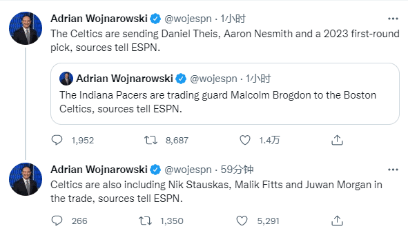 凯尔特人和步行者6换1交易的详细情况:凯尔特人送走泰斯、内史密斯、尼克-斯陶斯卡斯、马利克-费茨、朱万-摩根和2023首轮签,从步行者引援布罗格登。
