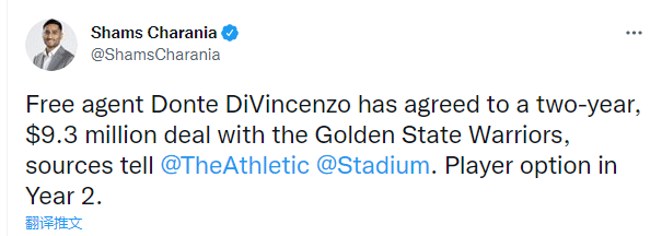 来源:24直播网07-02 10:4024直播网07月02日讯 ,勇士今夏第一笔引援达成,据名记shams和沃纳罗斯基联合报道,勇士已经和自由球员迪温琴佐达成2年930万美元的合同,第二年是球员选项。