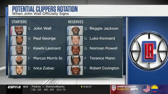 新赛季,快船的核心阵容是乔治、小卡、沃尔、小莫里斯、祖巴茨、雷吉-杰克逊、肯纳德、鲍威尔、曼恩以及考文顿等人;沃尔加盟后,快船队在2023年的夺冠赔率已经追平勇士,与凯尔特人、雄鹿并列联盟第一,力压篮网(第)、湖人(第7)和太阳等队成新赛季夺冠最大热门球队之一。