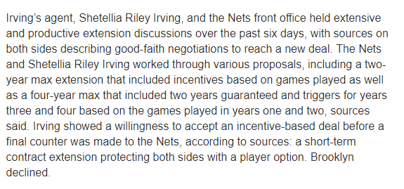 在给篮网最终答复之前,欧文对某个含有奖励机制的合同方案(带有球员选项可保护双方的短期合同)表现出了意愿,但篮网拒绝了。