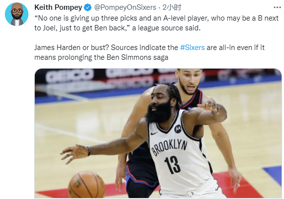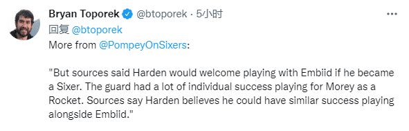 Keith Pompey在文章中表示,哈登乐意和恩比德一起打球,同时他相信和恩比德打球可以取得成功;76人想要为恩比德腾出更多空间,这是他们喜欢哈登的原因。