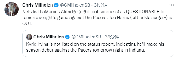 篮网官方已经确定欧文将在明天复出从而迎来赛季首秀,赛季至今,欧文已经缺席了35场比赛,期间篮网拿到23胜12负的战绩,排在东部第二。