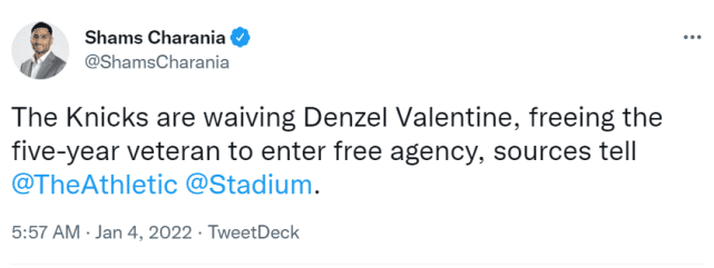 尼克斯通过这笔交易得到了瓦伦丁,这位昔日的14号秀,本赛季几乎没有太多上场时间,为骑士打了22场比赛,但场均只有9.3分钟的出场时间。不过,瓦伦丁的投篮能力不错,本赛季三分命中率达到40.9%。尼克斯随后又选择裁掉他,让他重新成为自由球员。