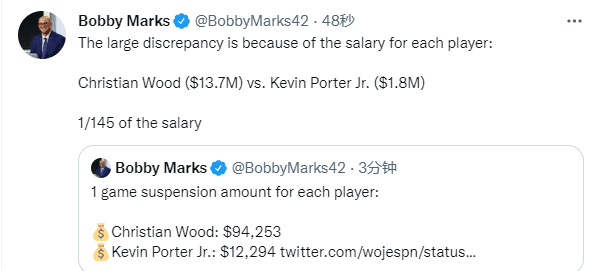 据薪资专家Bobby Marks进一步报道,伍德本赛季年薪是1370万美元,他被禁赛一场损失94253美元;小波特年薪是180万美元,被禁赛一场损失12294万美元,损失金额相差很大是因为他们的年薪不同,占薪水的1/145,两人累计损失大概10.7万美元。