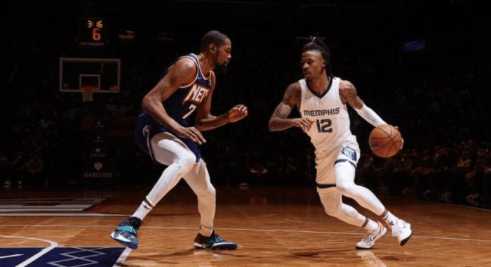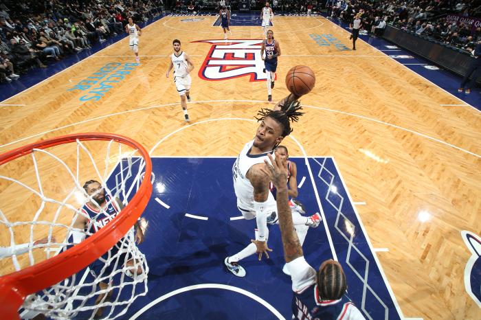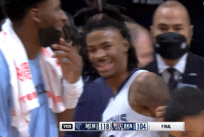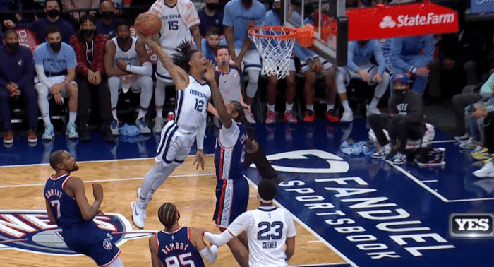 莫兰特第一节3投3中贡献9分,并且带队早早领先到两位数,灰熊一直压制篮网;下半场篮网第三节突然崩盘,莫兰特杀红眼,持球反击并且加速超车杜兰特上演不可思议的炸裂滑翔劈扣,多次杀到禁区得分,单节独砍18分带队打爆篮网,三节打完灰熊领先23分。