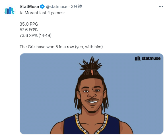 最近四场比赛,莫兰特打出全明星级别的表现,场均轰下35分,命中率57.6%,三分球17投14中,命中率高达73.6%;不久前,莫兰特凭借出色的表现力压詹姆斯当选西部周最佳球员,如今又带队大胜篮网,灰熊对阵篮网已经拿到五连胜。