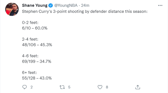 来源:24直播网01-03 15:5124直播网01月03日讯 ,名记肖恩-杨公布了库里本赛季的一组三分高阶数据。在不同距离下,防守球员对库里的三分命中率能造成多大影响?