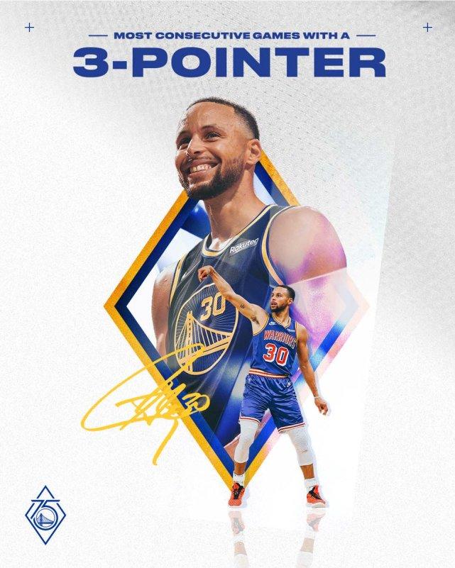 本赛季至今,库里已经创造多项三分纪录。他的生涯三分命中数超过了雷-阿伦,成为NBA历史三分王,他还成为史上首位命中至少3000记三分的球员,他也已经连续158场比赛命中三分,同样排名历史第一。