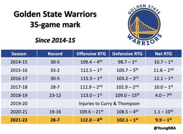 在库里的出色表现下,勇士已经取得28胜7负的战绩,继续领跑全联盟。数据显示,勇士前35场比赛的进攻效率排名联盟第4,防守效率排名联盟第1,净效率排名联盟第1。这三项数据在联盟中的排名,和2014-15赛季前35场时一样。2014-15赛季,勇士前35场30胜5负,最终夺冠。这个赛季,勇士能再次捧起总冠军奖杯吗?