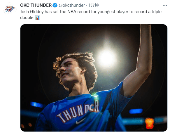 雷霆官方第一时间恭喜吉迪正式加冕历史最年轻三双先生。