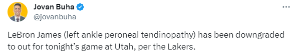 在上一场输给太阳的比赛中,詹姆斯在第二节空切时踩到了阿祖布克的脚,导致自己的脚踝崴了一下,崴脚后一瘸一拐十分痛苦,之后绑紧鞋带继续留在比赛中,带伤坚持仍难阻湖人惨败;赛后詹姆斯表示自己的脚踝伤势无碍,可今日对阵爵士,詹姆斯因伤无法出战,湖人官方已经宣布这一消息。