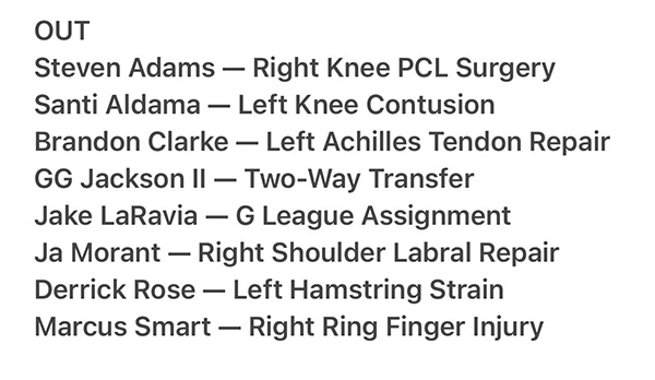 目前快船24胜13负排在西部第4位,与西部第一的森林狼仅仅只差2个胜场;快船众将已经飞往孟菲斯,小卡满脸笑容十分开心;快船有望轻松击败灰熊,因为灰熊伤员太多了,8名球员缺战——亚当斯(右膝手术、赛季报销)、莫兰特(肩膀手术、赛季报销)、克拉克(跟腱撕裂、去年3月缺战至今)、斯玛特(右手无名指严重受伤、预计伤缺六周)、罗斯(左腿拉伤、本场缺战)、阿尔达马(左膝挫伤、本场缺战)、拉拉维亚(发展联盟比赛任务)和GG-杰克逊(双向合同、发展联盟比赛)。