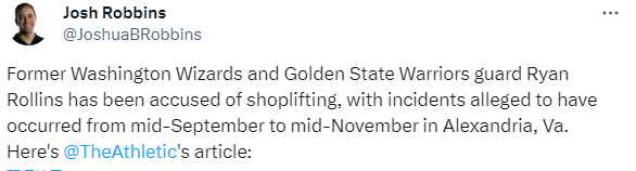 来源:24直播网01-12 19:3524直播网01月12日讯 ,据美媒The Athletic记者Josh Robbins报道,前勇士和奇才球员罗林斯摊上事了,因多次偷东西被指控偷窃罪;据悉,21岁的罗林斯7次偷窃蜡烛、沐浴露等物品,每次金额都不超过1000美元。