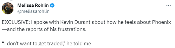杜兰特表示:“我不想被交易。我并不因为比尔受伤而感到沮丧。我并没有对球队中的角色球员而感到沮丧。(这个报道)对我来说真的很不尊重,你知道我在说什么吗?就像我们输了一场比赛,你认为我在输了一场比赛后还会感到高兴吗?我并没有对整个情况感到沮丧。我可能只会因为一场糟糕的比赛表现或艰难的比赛失利而感到沮丧。我很享受这种苦差事。”